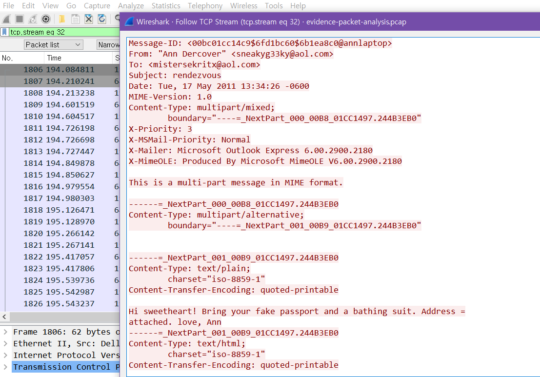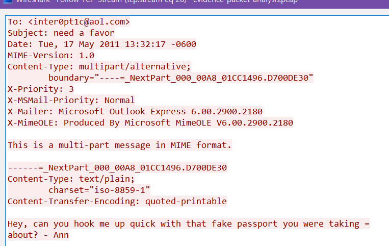Ann Dercover string 검색 -> TCP Stream -> 앤이 보낸 이메일들이 몇 개 보인다