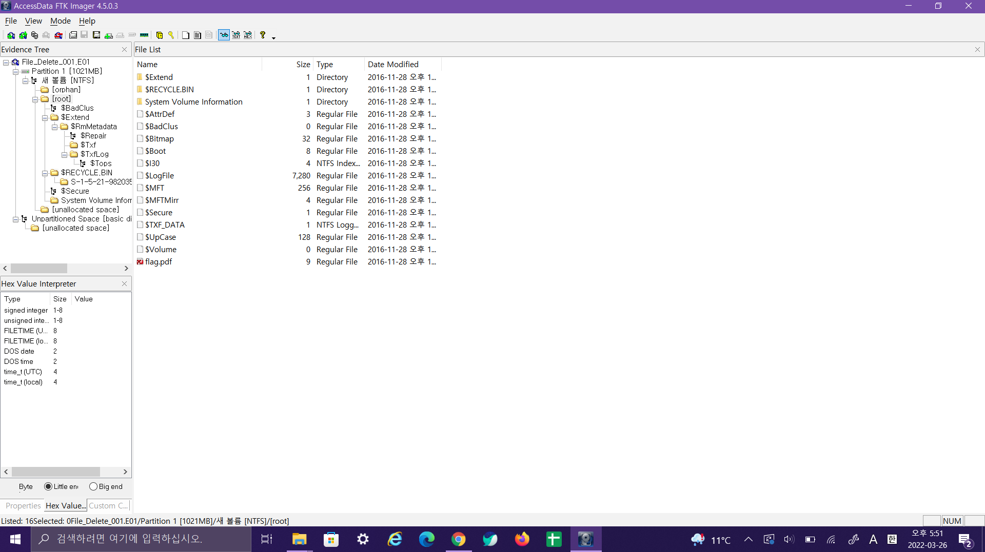 E01 파일은 디스크 이미징 파일이다. 오랜만에 예전에 잠깐 사용해봤던 FTK Imager를 사용해 파일을 열어보았다.