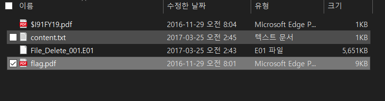 root 폴더에 들어가보면 바로 flag.pdf 라는 파일을 찾을 수 있다. 이 파일은 삭제된 파일이기 때문에 X 표시가 되어있는 것도 확인할 수 있다. 이것을 Export files 해보면 복구가 가능하다.