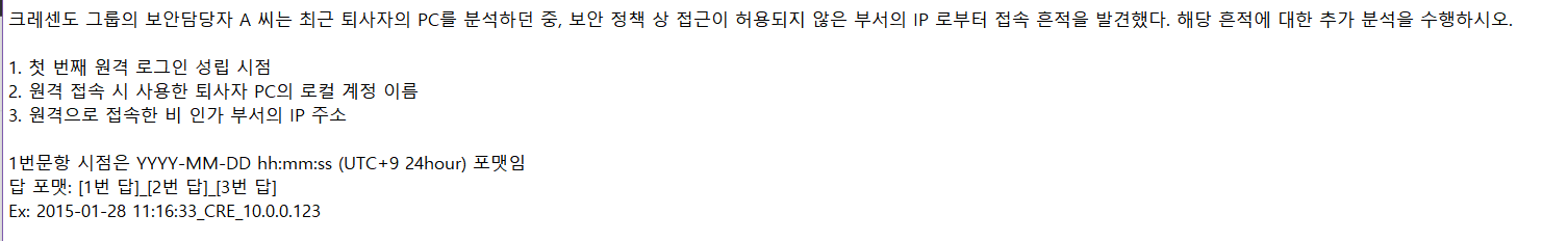 처음에는 로그온 유형 3인가 싶었는데 굉장히 log가 많고, 보안 ID 및 계정 정보가 다 null id, anonymous 등으로 떠서 문제에 부합하지 않는 듯하여 뺐다. 그랬더니 아래와 같이 로그온 유형 10의 log를 찾을 수 있었다.