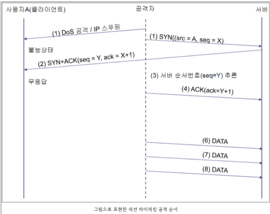 서버와 클라이언트에 각각 잘못된 Sequence number을 사용해서 잠시 혼란을 준 뒤 공격자가 세션을 탈취하는 방식.